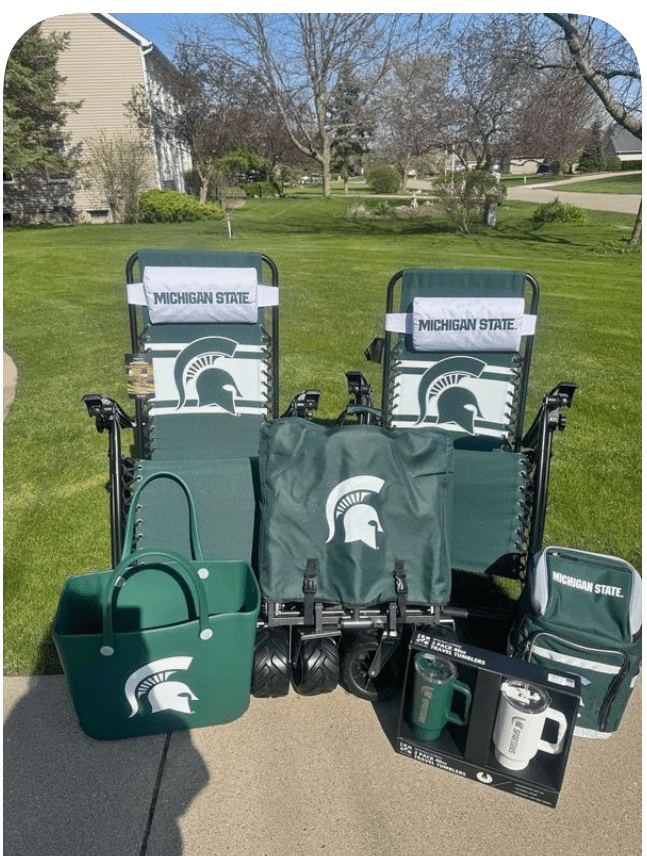 Get ready for summer parties or fall tailgating! This package includes two folding chairs, a collapsible wagon, cooler, green and white insulated mugs and a durable tote, all officially licensed with Spartan logos.